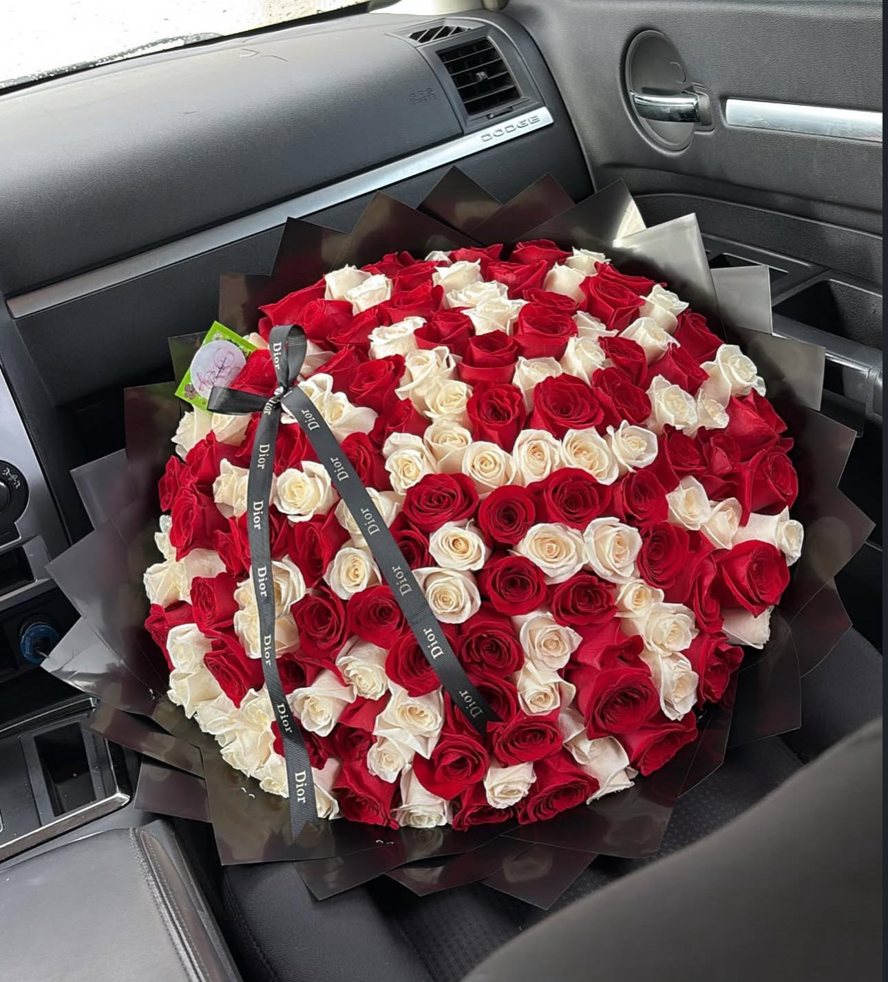 A beautiful red and white rose bouquet, perfectly wrapped in black paper for a bold, elegant look. 🌹(Picture shown is 150 roses)